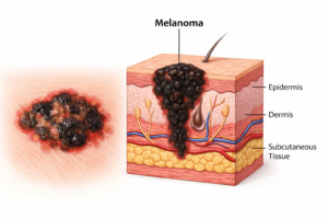 El Melanoma es el tipo más agresivo. Se origina en los melanocitos (las células que dan color a la piel) y puede desarrollarse sobre un lunar previo o aparecer como una nueva lesión.