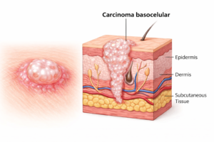 El Carcinoma basocelular es el cáncer de piel más frecuente. Crece lentamente y rara vez produce metástasis, pero puede invadir tejidos cercanos si no se trata.