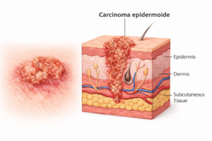 El Carcinoma epidermoide puede desarrollarse a partir de lesiones precancerosas como las queratosis actínicas. Tiene mayor capacidad de diseminación que el basocelular si no se trata.